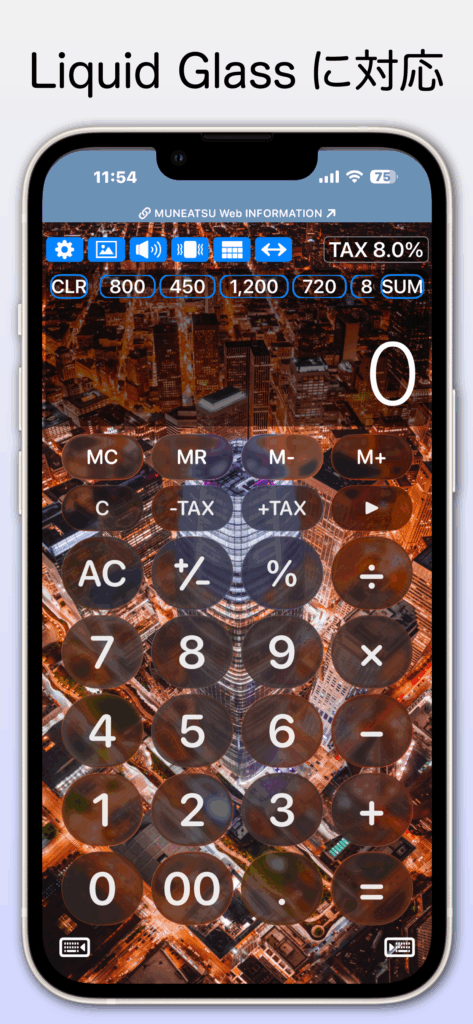 iPhone版「単純な電卓」 Version4.0公開 2025年9月29日 最終更新日時 : 2025年9月29日 MUNEATSU G.K. iPhone用無料電卓アプリ「単純な電卓」に、iOS26のLiquid Glass機能を追加した新バージョンv4.0をリリースしました! 新しくなったiOS26のLiquid Glassの感覚を是非お楽しみください。 <-BACK